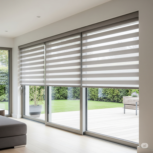 Sistem tirai panel geser yang modern, ideal untuk pintu geser atau jendela besar, memberikan tampilan yang sangat bersih dan kontemporer.